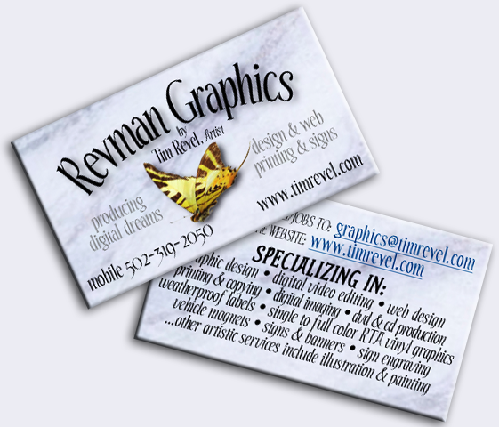 Tim Revel, the digital handyman, wants to help in every way with your most important projects. Contact Tim and see the many ways he can assist with family projects and memory presorvation. Virtually any need can be developed digitally with the help and artistic influence of Revman Graphics. To sum it up, add FREE delivery to your business or home as an added value just for you. Contact Tim Revel today at (502) 319-2050. Or email Tim right now by clicking on the card below:
